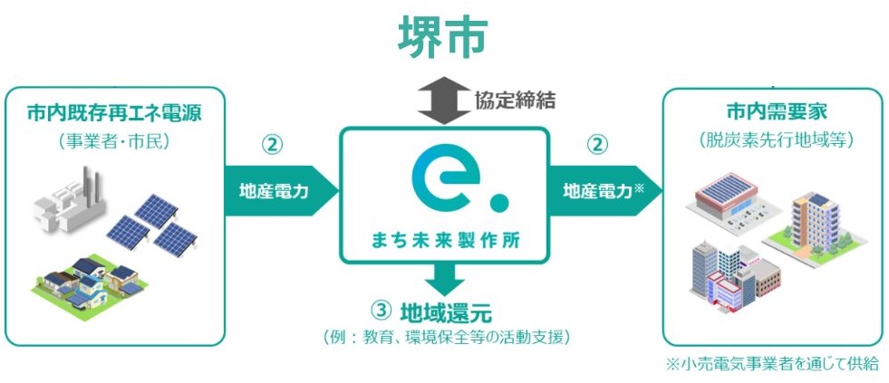 株式会社まち未来製作所と大阪府堺市(市長:永藤 英機、以下:堺市)は、再生可能エネルギー(以下、「再エネ」)電力の地産地消を推進することを目的に、「e.CYCLE(いいサイクル)」を活用した取り組みに関する連結協定を、2025年9月30日に締結いたしました。